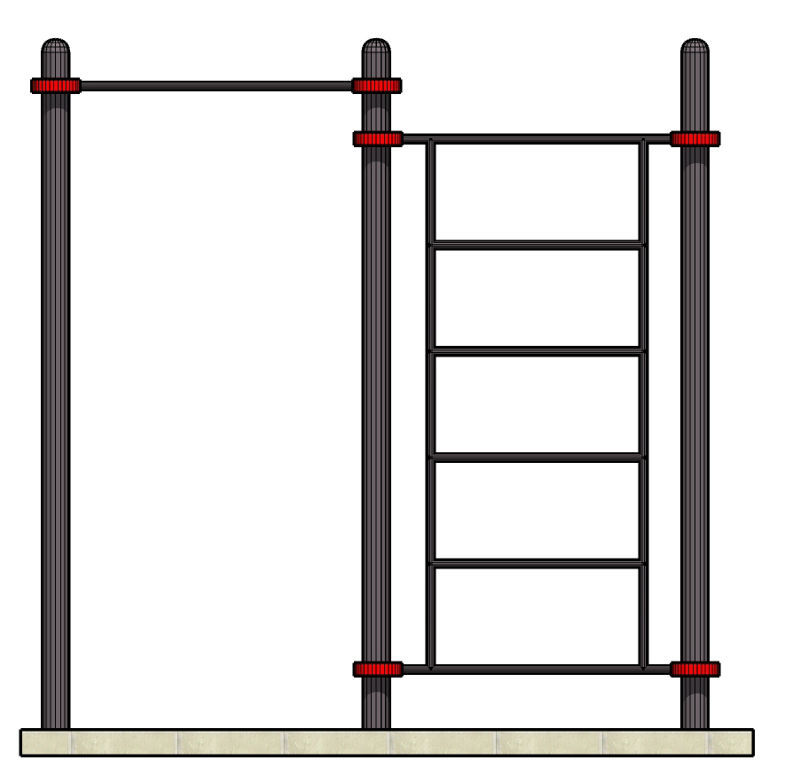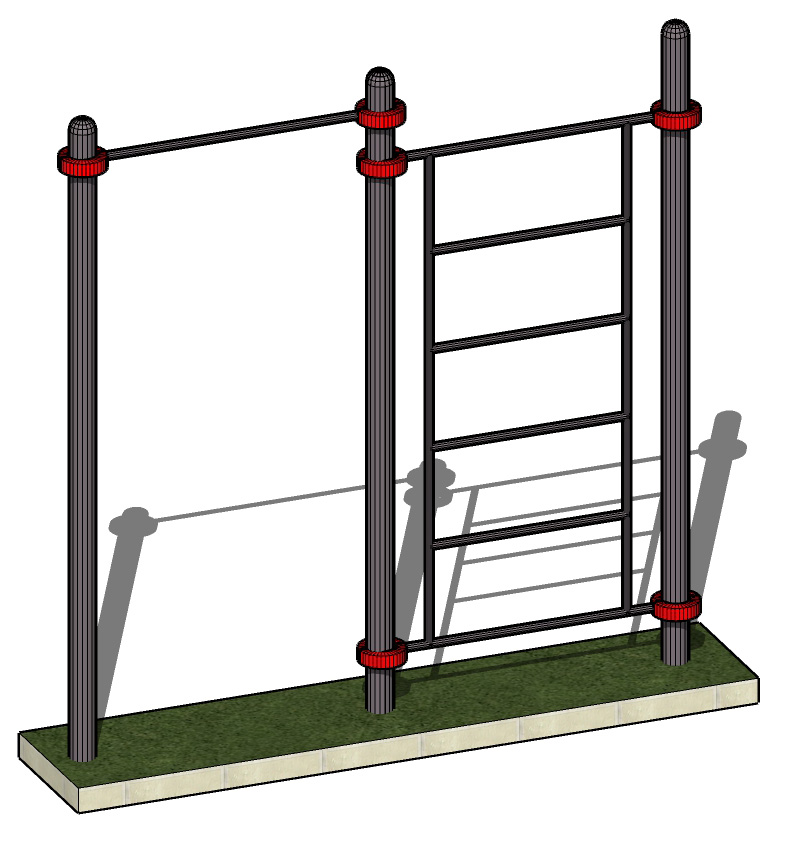 К опорным столбам высотой 2600мм крепятся с помощью хомутов на высоте от уровня основания: 2550 мм – перекладина туника шириной 1200 мм, 2400 мм –шведская стенка. Ширина шведской стенки 1200 мм. Шаг составляет – 34 см. Общая длина комплекса составляет не более 2700 мм.